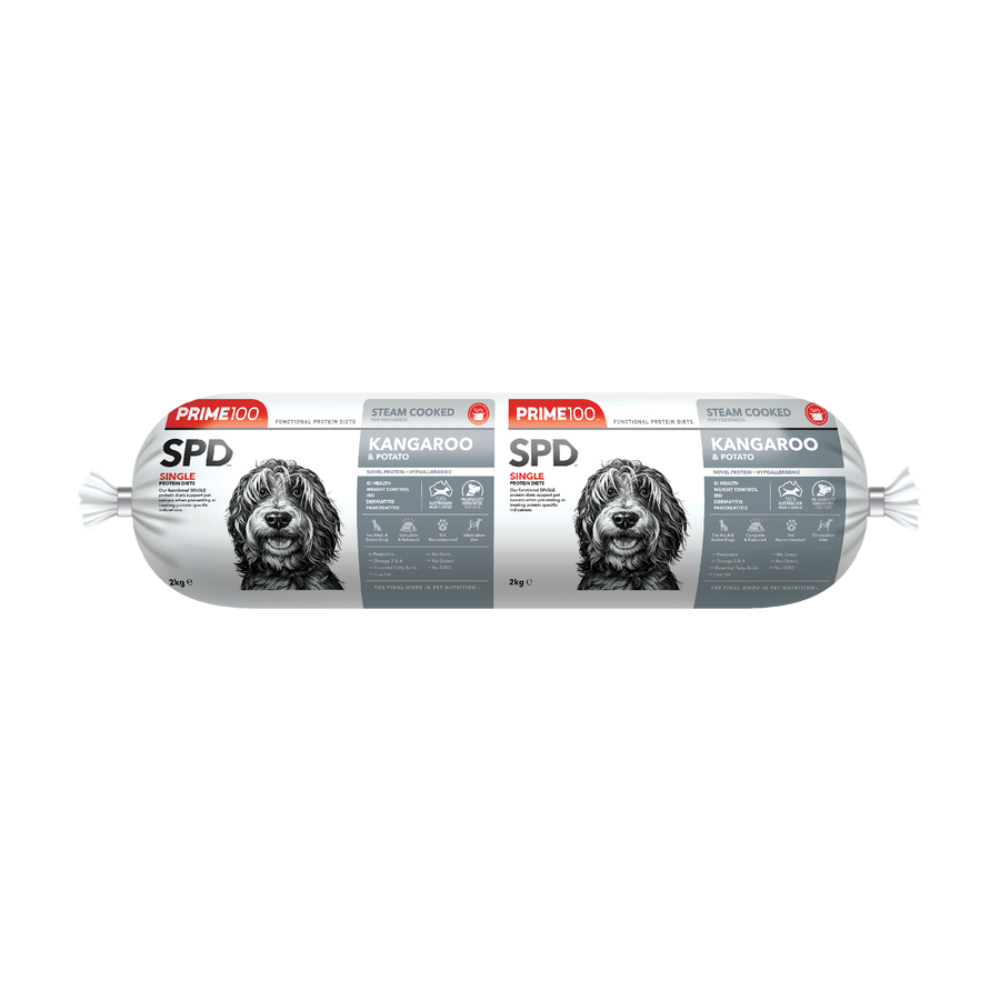 Prime100 SPD Fresh Roll Kangaroo & Potato is a novel, hypoallergenic, single protein diet created for dogs with suspected food sensitivities, skin allergies or digestive issues. Ideal for elimination diets, food trials or to be fed as an ongoing maintenance diet. This complete and balanced, low-fat diet is formulated for adult and senior dogs with acute gastrointestinal indications such as pancreatitis, IBD or diabetes. With added natural digestive enzymes to help improve gastrointestinal health and added functional oils rich in EPA and DHA for optimum skin and coat health, and animal wellbeing.