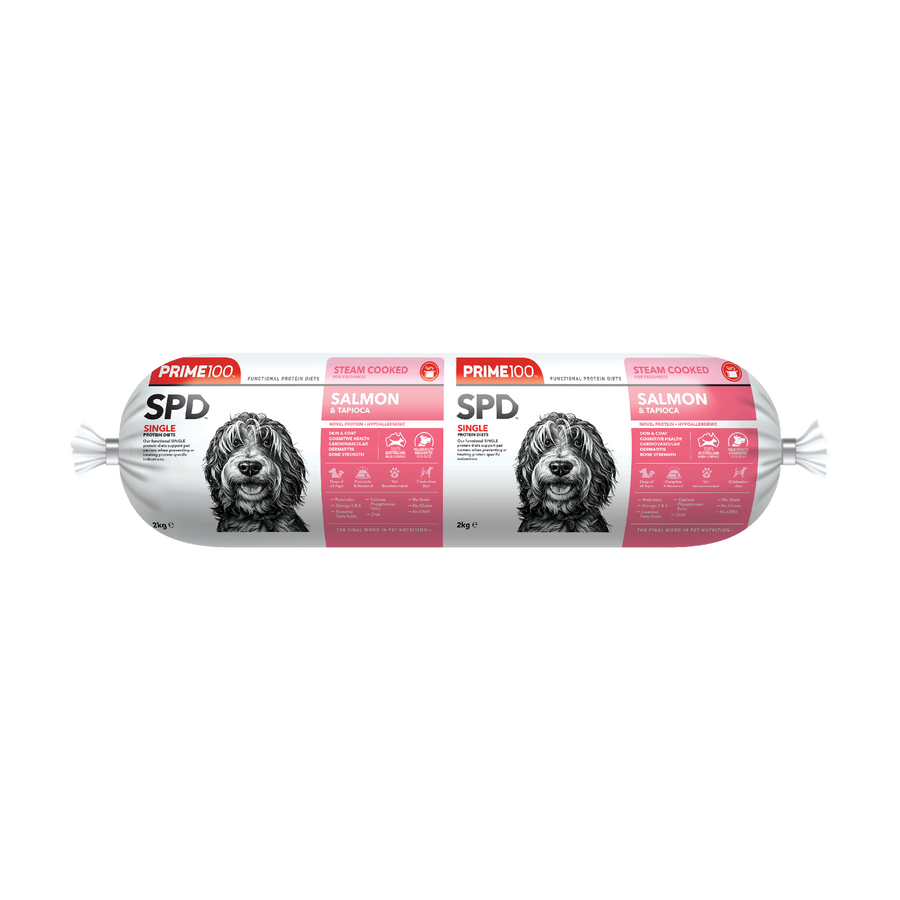 Prime100 SPD Fresh Roll Salmon & Tapioca is a novel, hypoallergenic, single protein diet designed for dogs with suspected food sensitivities, skin allergies or digestive issues. Complete and balanced for dogs of all ages, including giant breed puppies, with a natural source of essential fatty acids to assist with cognitive and cardiovascular health. With added natural digestive enzymes to help improve gastrointestinal health and added functional oils rich in EPA and DHA for optimum bone health, dermatitis, and animal wellbeing. Bamboo fibre acts as a functional prebiotic for digestion. No added artificial colours or flavours.